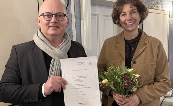 Eine Dankurkunde, unterzeichnet von Jürgen Vorndran, Generalvikar der Diözese Würzburg, überreicht Pfarrer Stephan Frank im Pfarrbüro Untereßfeld an Christine Dietz ...