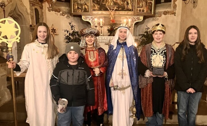 Die Augen der 6 Sternsingerinnen und Sternsinger strahlten mit ihren Kronen um die Wette. Am Tisch verkündete Magdalena Schneider der königlichen Schar und den erwachsenen Begleitenden das Ergebnis ...