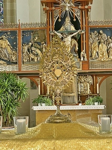Auf die am Altar ausgesetzte Monstranz wies der Prediger hin und sagte. „Gott setzt sich uns aus und wir setzen uns ihm aus.“ Er sei es, der zu den Menschen spricht und ihnen sagt: Wenn Du die Macht, die dich beschützt ahnen würdest, würdest du niemals Angst haben. Wenn du ahntest, welche Hoffnung ich auf dich setze, würdest Du deinen Weg großmütiger gehen. Wenn du ahntest wie gut ich es mit dir meine, würdest Du vielmehr von mir erbitten. Wenn du ahntest welch unendliche Güte mich erfüllt, würdest Du dich mir leichter anvertrauen und wenn du ahntest mit welcher Wachsamkeit ich dich umgebe, würdest du in ständiger Freude leben.“