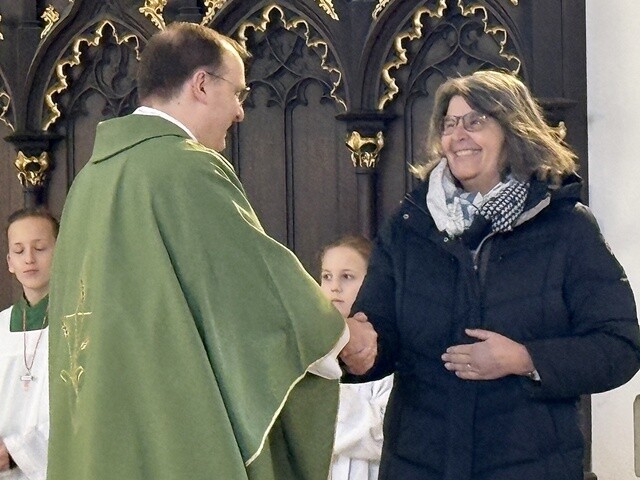Pastoralreferentin Alice Düchs dankte dem Weihbischof im Anschluß der Messfeier für die beeindruckende Predigt und dafür, dass er zugesagt habe, nach Bad Königshofen zu kommen, um hier die Gebetstage zu eröffnen. Als Geschenk gab es „Königshöfer Pflasterstee“, die daran erinnern, dass Königshofen einst die ersten gepflasterten Straßen hatte. Dazu überreichte sie ein Lebkuchenherz mit den Initialen P R. Das stehe für den Pastoralen Raum Bad Königshofen zum einen und es seien auch die Initialen von Weihbischof Paul Reder. „Es ist ein Herz, das mit Liebe gebacken wurde.“  Weihbischof Paul Reder sei somit die Verbindung zu den neuen Pastoralen Räumen. Der Weihbischof bedankte sich sehr herzlich, sagte, dass er sehr gerne gekommen sei und sich auf die anschließende Begegnung im Pfarrgemeindehaus freue.