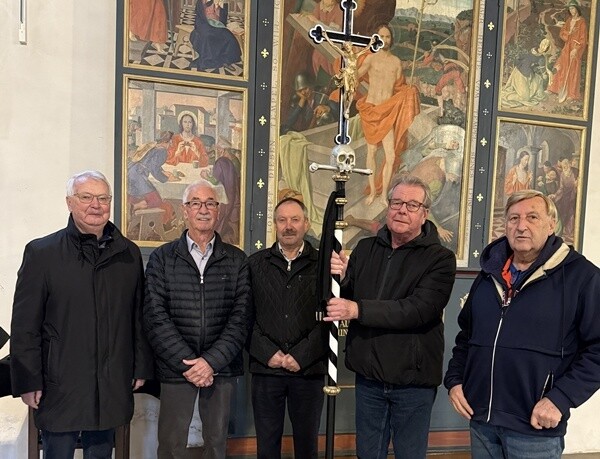 Hier sah man die Instandsetzung und damit Sicherung des Friedhofskreuzes der Stadtpfarrkirche als zuwendungsfähig im Hinblick auf die historische Vergangenheit an. Nach dem Festgottesdienst am Sonntag übergab der Künstler, Peter Picciani das renovierte Friedhofskreuz an Küster Michael Löhr, Clemens Behr und Heinrich Weber, sowie Hanns Friedrich, Vorsitzender im Verein für Heimatgeschichte.